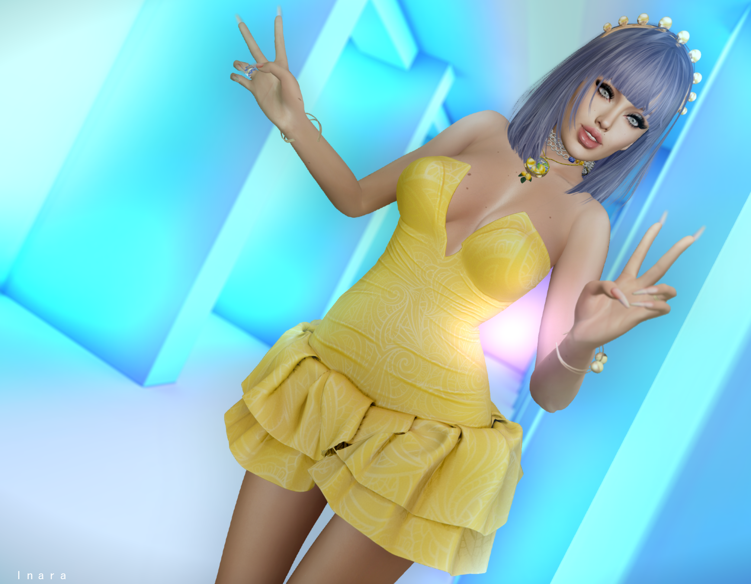 I am featuring for you today the Cherry Bomb Pose Fatpack from Dovely, one of our new awesome sponsors. I had so much fun using the poses for this outfit I put together for you. This gorgeous yellow dress is from Amias and is part of the Cosmopolitan event. I love the deep V-neck and the ruffled hem which makes it very flirty, and great for a date night or out with the ladies. The yellow dress is part of the Fatpack option, just FYI. I paired this dress with these beautiful high heels with its unique strap from WellMade. It's part of the #BIGGIRL event going on right now and is available until August 10th. The accessories I chose are from LaGyo. The dangling lemons in the necklace really make this outfit quite fun. And how cute are these pearl headbands, right? I am wearing the matching bracelets as well.
